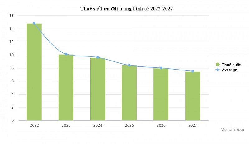 Theo đó, thuế nhập khẩu ưu đãi trung bình đến năm 2027 dự kiến giảm một nửa so với mức thuế suất hiện hành. Cụ thể, thuế suất trung bình năm 2022 là 14,8%; năm 2023 là 10,1%; năm 2024 là 9,6%; năm 2025 là 8,4%; năm 2026 là 8% và năm 2027 là 7,5%.