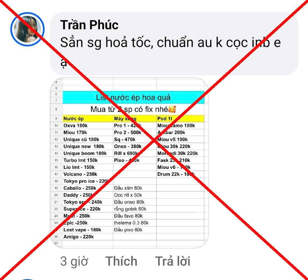 Cụ thể, tối ngày 24/3, trang facebook này đăng bài “xin phép QTV họp chợ”. Ngay lập tức ở phần bình luận, dưới bài viết xuất hiện hàng loạt giao dịch diễn ra sôi động. Một tài khoản facebook tên Trần Phúc rao: “Sẵn SG hỏa tốc, chuẩn auth, không cọc. Inbox em ạ”. Bên dưới là bảng giá chi tiết các loại máy hút và tinh dầu kèm cam kết giảm giá khi mua từ 2 sản phẩm trở lên. Một tài khoản khác tên Thảo Ly đăng tải hình ảnh các loại tinh dầu và pod system, kèm theo số điện thoại liên hệ trên Zalo.