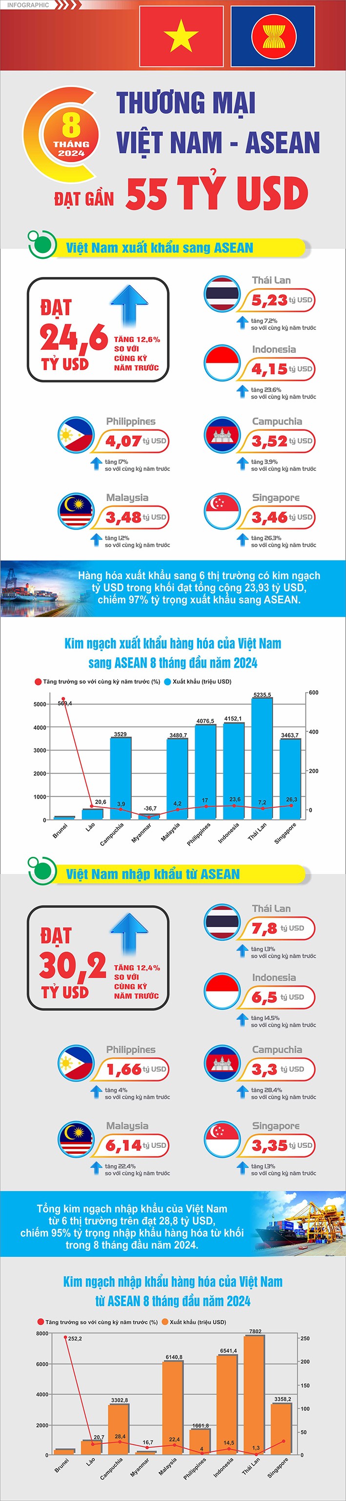 Theo Tổng cục Hải quan, 8 tháng đầu năm 2024, thương mại Việt Nam - ASEAN đạt gần 55 tỷ USD, tăng 12,5% so với cùng kỳ năm trước. Việt Nam thu về 24,6 tỷ USD từ hoạt động xuất khẩu hàng hóa, tăng 12,6% so với cùng kỳ năm trước. Về nhập khẩu, Việt Nam chi 30,2 tỷ USD nhập khẩu hàng hóa từ ASEAN trong 8 tháng đầu năm, tăng 12,4% so với cùng kỳ năm trước.