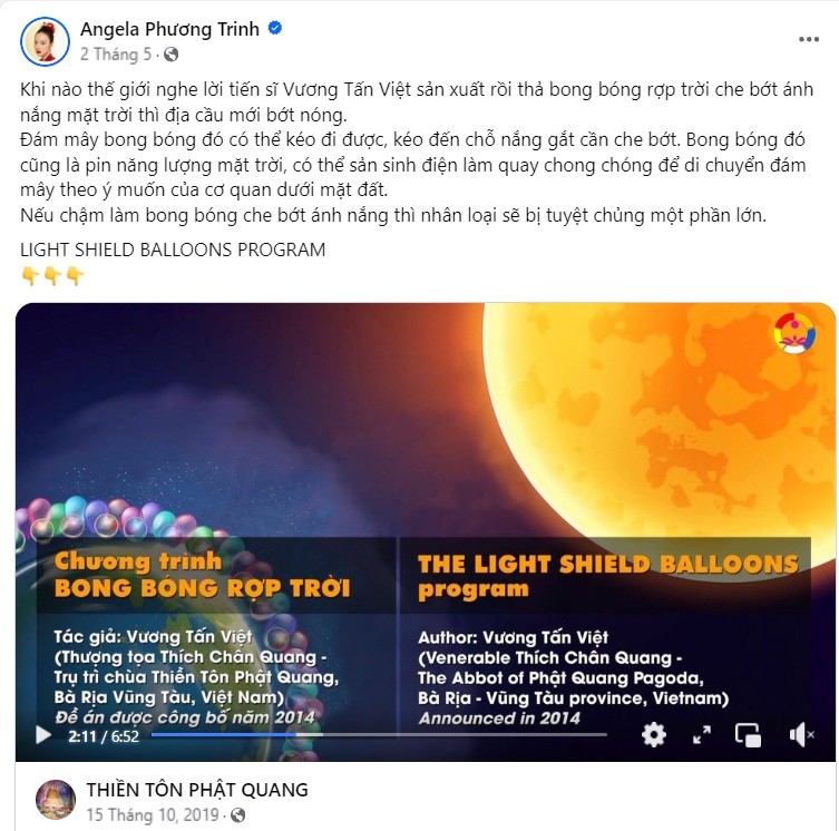Đoạn video này cũng được nữ diễn viên Angela Phương Trinh chia sẻ lại với lời bình: “Khi nào thế giới nghe lời Tiến sĩ Vương Tấn Việt sản xuất rồi thả bong bóng rợp trời che bớt ánh nắng mặt trời thì địa cầu mới bớt nóng. Đám mây bong bóng đó có thể kéo đi được, kéo đến chỗ nắng gắt cần che bớt. Bong bóng đó cũng là pin năng lượng mặt trời, có thể sản sinh điện làm quay chong chóng để di chuyển đám mây theo ý muốn của cơ quan dưới mặt đất. Nếu chậm làm bong bóng che bớt ánh nắng thì nhân loại sẽ bị tuyệt chủng một phần lớn”.