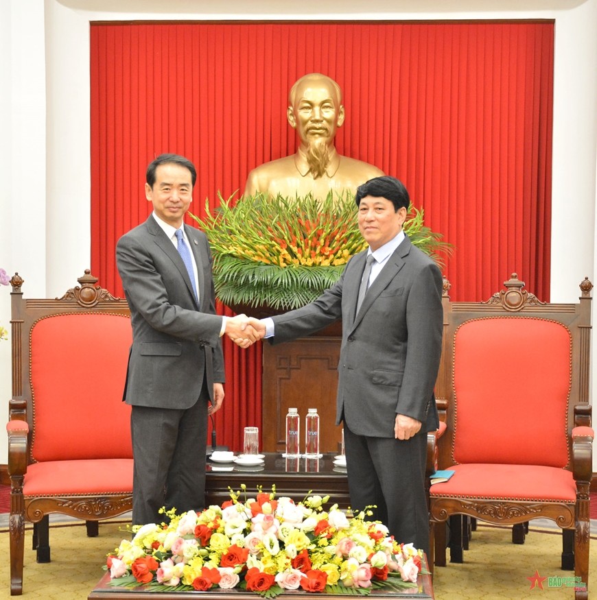 | Thường trực Ban Bí thư Lương Cường tiếp Đại sứ Hà Vĩ. Ảnh: Báo QĐND |