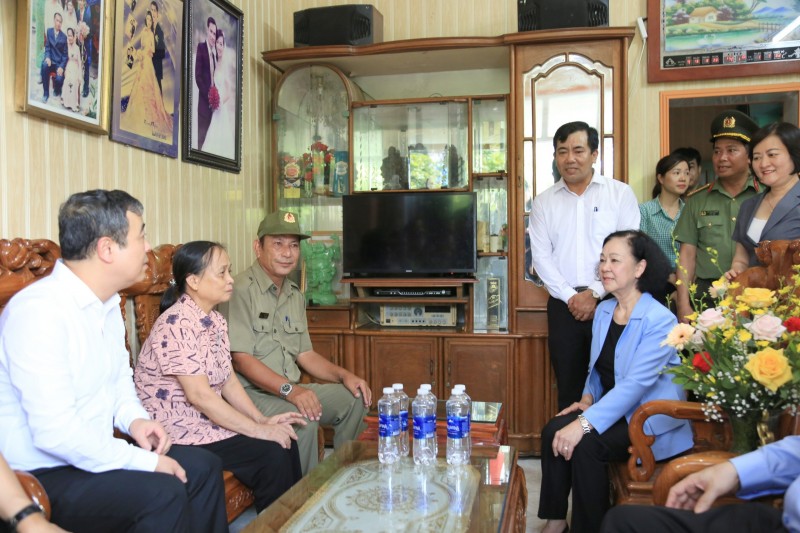 | Đồng chí Trương Thị Mai - Ủy viên Bộ Chính trị, Thường trực Ban Bí thư, Trưởng Ban Tổ chức Trung ương tặng nhà tình nghĩa, tặng quà cho hộ nghèo, gia đình có công trên địa bàn. (Ảnh: Nam Hồng) |
