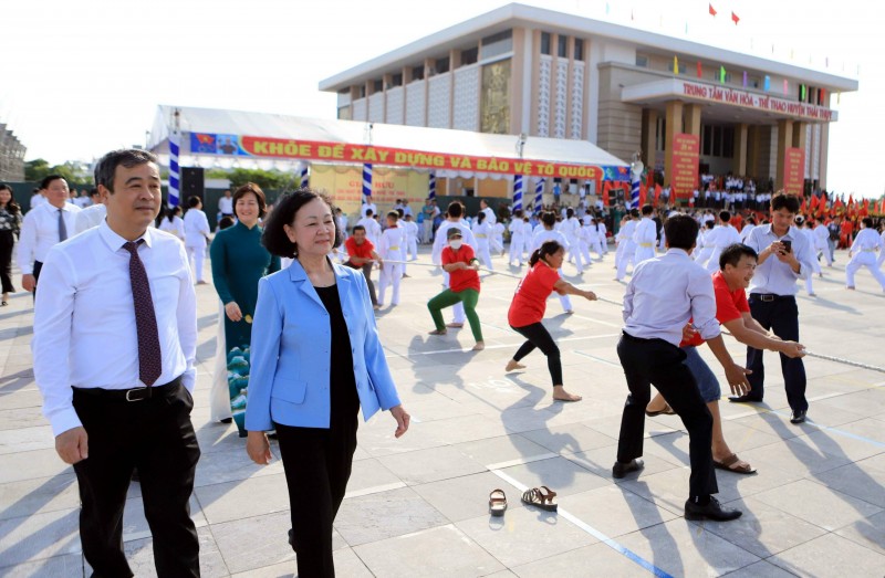 | Đồng chí Trương Thị Mai cùng hòa mình vào các hoạt động văn hóa, thể thao của người dân thị trấn Diêm Điền, huyện Thái Thụy, tỉnh Thái Bình. (Ảnh: Nam Hồng) |