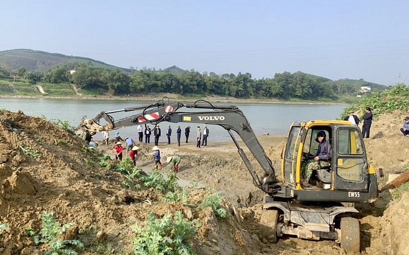 Nhiều địa phương ở Nghệ An huy động máy móc và người dân nạo vét luồng dẫn nước sông Lam. |