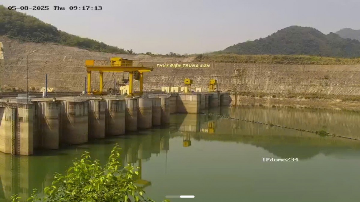 | Hồ chứa thủy điện Trung Sơn duy trì mực nước tối thiểu, đảm bảo cấp nước mùa cạn và phát điện mùa cao điểm nắng nóng (tháng 5/2025) |