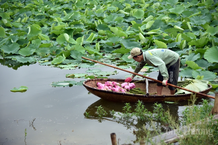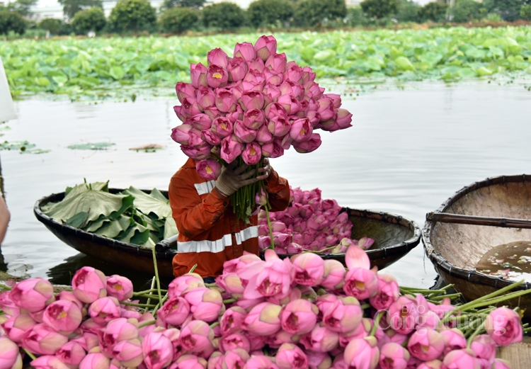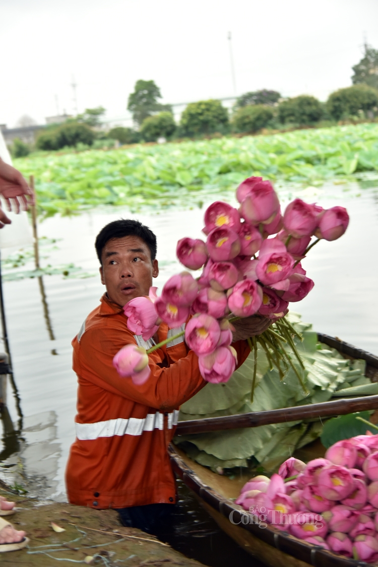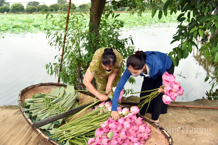 Vào vụ thu hoạch hoa sen, ông Phương “huy động” cả vợ con dậy từ 4 giờ sáng để thu hái. Khi hoa nở rộ, gia đình phải thuê thêm thợ để thu hái hoa sen. Ông Phương bật mí, thợ thuê hái hoa sen trả công khá cao, trung bình 300 nghìn đồng cho 1,5 giờ đến 2 giờ thu hái. Việc trả công cho thợ hái hoa sen cao như vậy bởi không phải ai cũng có thể hái sen được. Những người thu hái sen phải là người biết chèo thuyền và có kinh nghiệm hái hoa đảm bảo cây không gẫy và hoa sen nát.