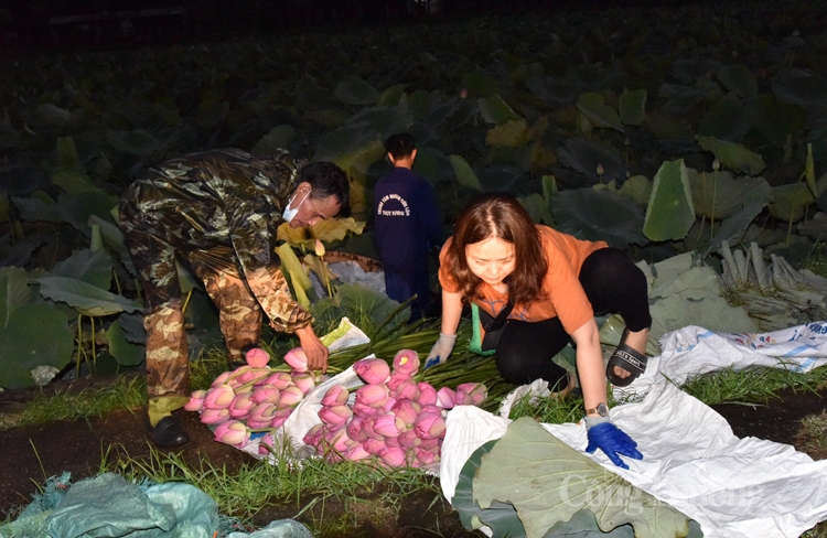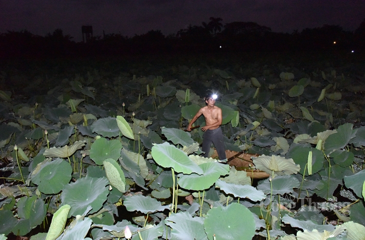 Đặc biệt thu hái sen khi trời nhá nhem, ngoài đôi mắt tinh nhanh, người thu hái sen điều khiển con thuyền luồn lách qua những khóm sen thoắt ẩn thoắt hiện trong hồ sen mênh mông. Nhờ chiêc đèn pin soi rọi, đôi mắt tinh nhanh của họ tìm kiếm được những búp sen chúm chím đang lấp ló giấu mình sau những tấm lá. Họ hái nhanh, nhưng cũng nhẹ nhàng để búp sen không nhàu nát. Hay là ở chỗ, như một nghệ thuật, người hái bẻ đúng đoạn ngó non và sắp xếp nhẹ nhàng và chính xác vào mạn thuyền. Chỉ chốc lát, con thuyền đã đầy ắp sen, búp nào búp nấy tròn trịa, đều tăm tắp.