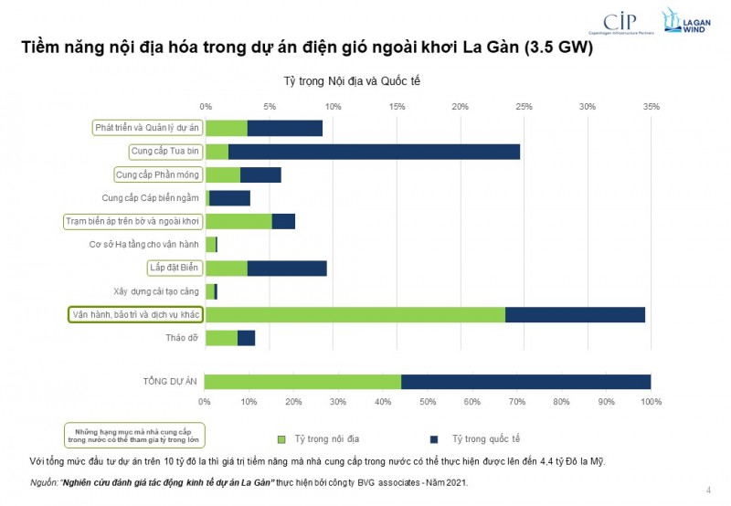 Theo một báo cáo do BVG Associates thực hiện năm 2021 nghiên cứu đánh giá tác động kinh tế dự án điện gió ngoài khơi La Gàn có công suất dự kiến 3,5GW nằm ngoài khơi tỉnh Bình Thuận, trên 40% tỷ trọng trong chuỗi cung ứng cho dự án có thể được thực hiện bởi các công ty tại Việt Nam.