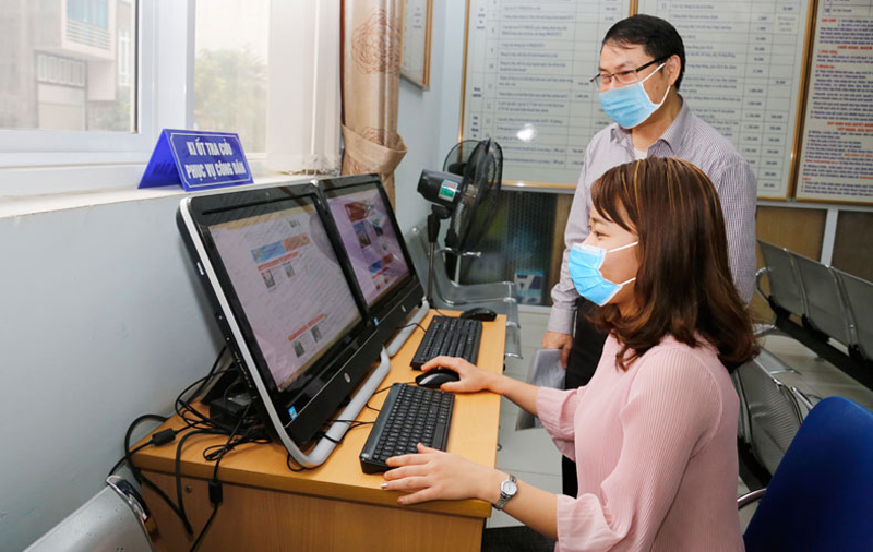 Người dân tìm hiểu về đăng ký hộ tịch trực tuyến tại bộ phận “một cửa” quận Bắc Từ Liêm. Ảnh: Nhật Nam