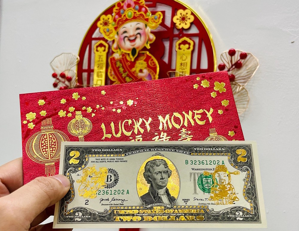 Bên cạnh đó, trên thị trường còn xuất hiện tờ tiền 2 USD hình con rồng mạ vàng 3D và thần tài 3D, giá 150.000 đồng. Mỗi tờ 2 USD mạ vàng được đặt trong 1 bao lì xì đỏ.