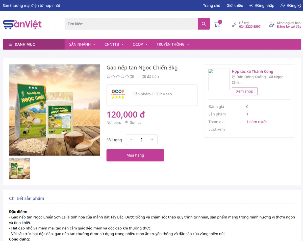 | Các sàn thương mại điện tử như Sàn Việt là kênh quảng bá hữu hiệu cho các sản phẩm OCOP của Sơn La, trong đó có gạo nếp tan Ngọc Chiến. Ảnh chụp màn hình |