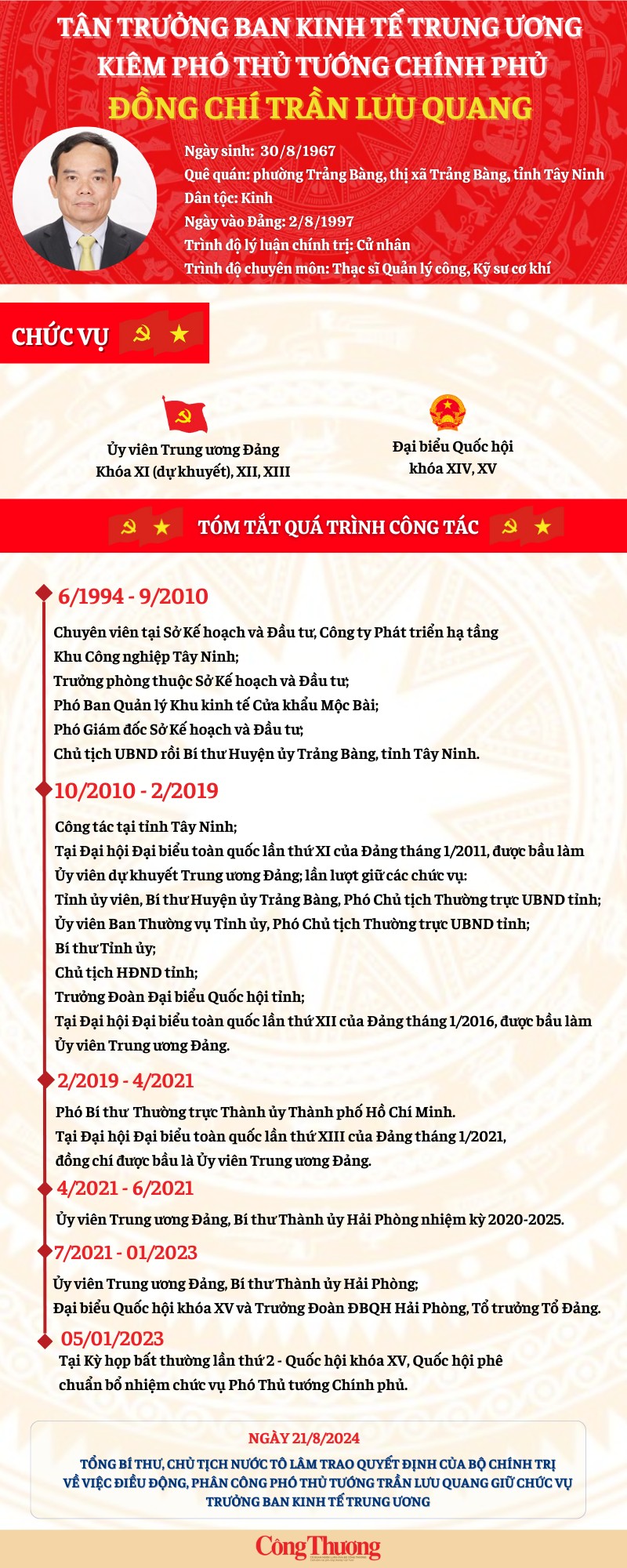 Chiều 21/8, Tổng Bí thư, Chủ tịch nước Tô Lâm đã trao Quyết định của Bộ Chính trị điều động, phân công ông Trần Lưu Quang, Ủy viên Trung ương Đảng, Phó Thủ tướng, giữ chức Trưởng Ban Kinh tế Trung ương.