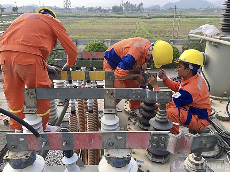 | Công nhân PC Nghệ An kiểm tra thiết bị ngoài trời tại TBA Hưng Hòa (Nghệ An) |