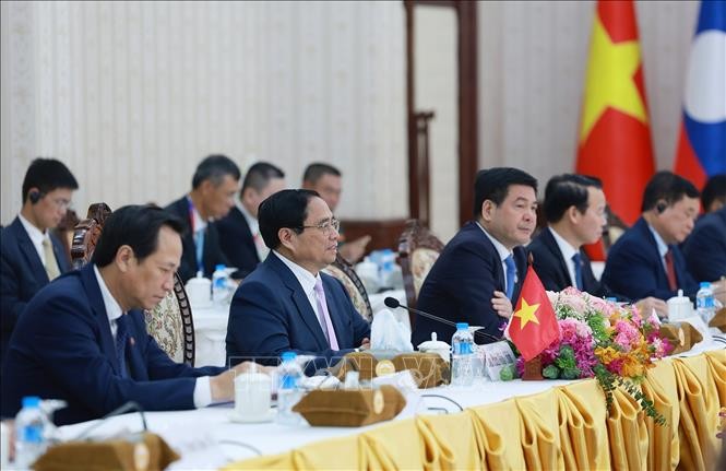 | Thủ tướng Phạm Minh Chính hội kiến Thủ tướng Lào Sonexay Siphandone. Ảnh: Dương Giang/TTXVN |