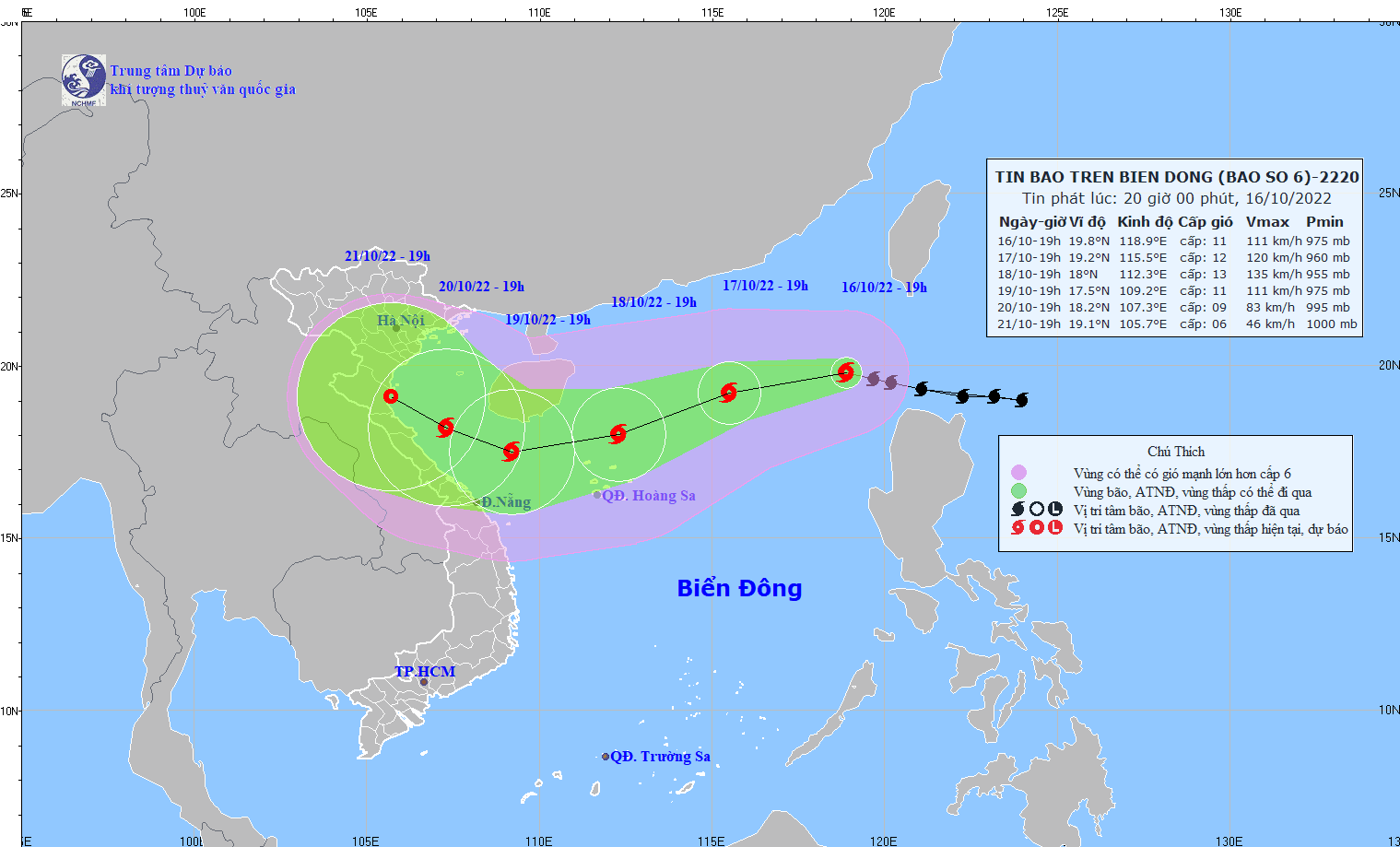 Dự báo diễn biến bão (trong 24 đến 48 giờ tới): Đến 19h ngày 17/10/2022, bão số 6 di chuyển theo hướng Tây Tây Nam, 15 km/h và có khả năng mạnh thêm. Ví trí tâm bão ở vào khoảng 19,2 độ Vị Bắc; 115,5 độ Kinh Đông, cách quần đảo Hoàng Sa khoảng 530km về phía Đông Bắc, sức gió mạnh nhất gần tâm bão cấp 12 giật cấp 15.