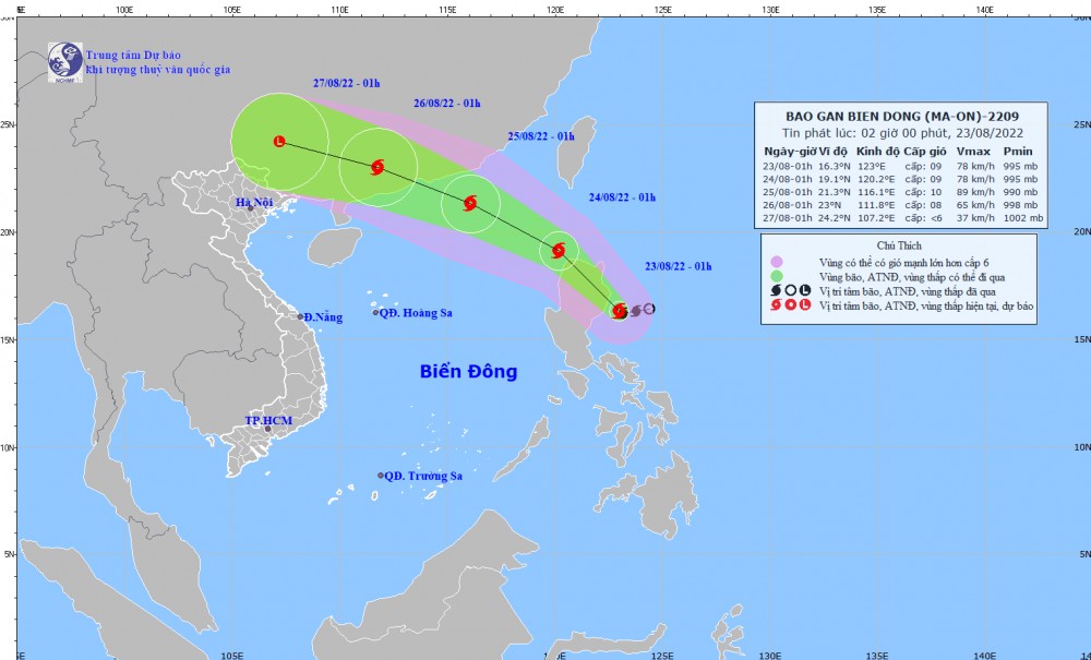 Tin bão số 3: Trung tâm dự báo khí tượng thủy văn quốc gia cho biết, dự báo trong 24 giờ tới, cơn bão số 3 có tên quốc tế là Ma-on di chuyển theo hướng Tây Bắc, mỗi giờ đi được 15-20km. Đến 1 giờ ngày 24/8, vị trí tâm bão ở khoảng 19,1 độ Vĩ Bắc; 120,2 độ Kinh Đông, trên khu vực phía Tây Bắc đảo Lu-dông (Philipines). Sức gió mạnh nhất vùng gần tâm bão mạnh cấp 9 (75-88km/giờ), giật cấp 12.