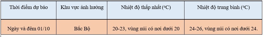 Trên đất liền:Dự báo thời tiết, gần sáng và ngày mai 01/10, bộ phận không khí lạnh này sẽ ảnh hưởng đến khu vực phía Đông Bắc Bộ, sau đó ảnh hưởng đến Bắc Trung Bộ, một số nơi ở phía Tây Bắc Bộ và Trung Trung Bộ. Gió chuyển hướng Đông Bắc trong đất liền cấp 3, vùng ven biển cấp 4-5.