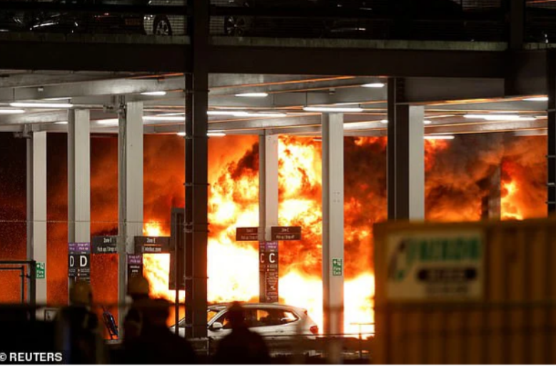 Vụ hỏa hoạn bắt đầu bùng phát tại một bãi đậu xe mới xây của sân bay khiến tòa để xe nhiều tầng này chìm trong biển lửa.