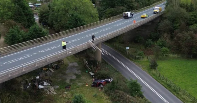 Khoảng 1h20 chiều ngày 21/10, một người đàn ông và một phụ nữ khoảng 70 tuổi đang đi trên chiếc Vauxhall Grandland màu đỏ đã va chạm với rào chắn cầu trên đường tránh phía Tây A629 và rơi xuống ít nhất 10 mét.