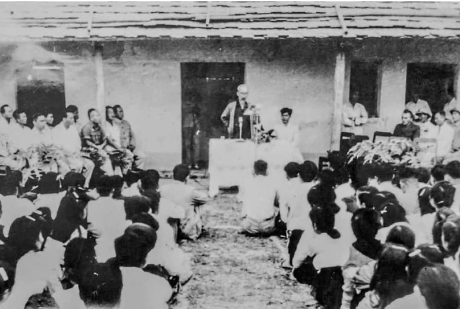| Bác Hồ nói chuyện với cán bộ, chiến sĩ và Nhân dân các dân tộc tỉnh Lào Cai ở khu vực K30, nay là công viên Hồ Chí Minh thành phố Lào Cai, được công nhận là Di tích lịch sử quốc gia. (Ảnh: Tư liệu) |
