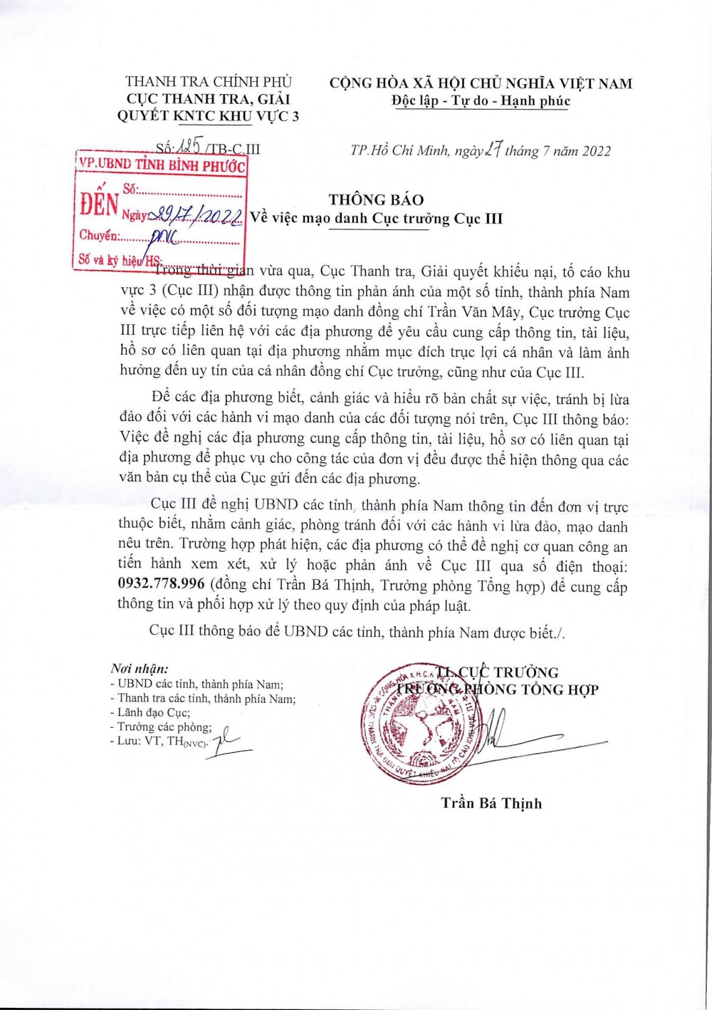 Trước đó, Cục Thanh tra giải quyết khiếu nại tố cáo Khu vực 3 có thông báo đến các tỉnh, thành phía Nam về về việc mạo danh Cục trưởng Cục 3.