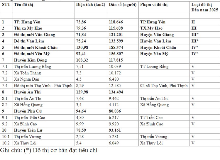 2 đô thị cơ bản đạt tiêu chí đô thị loại IV: đô thị mới Khoái Châu (khu vực huyện Khoái Châu); đô thị mới Yên Mỹ (khu vực huyện Yên Mỹ);