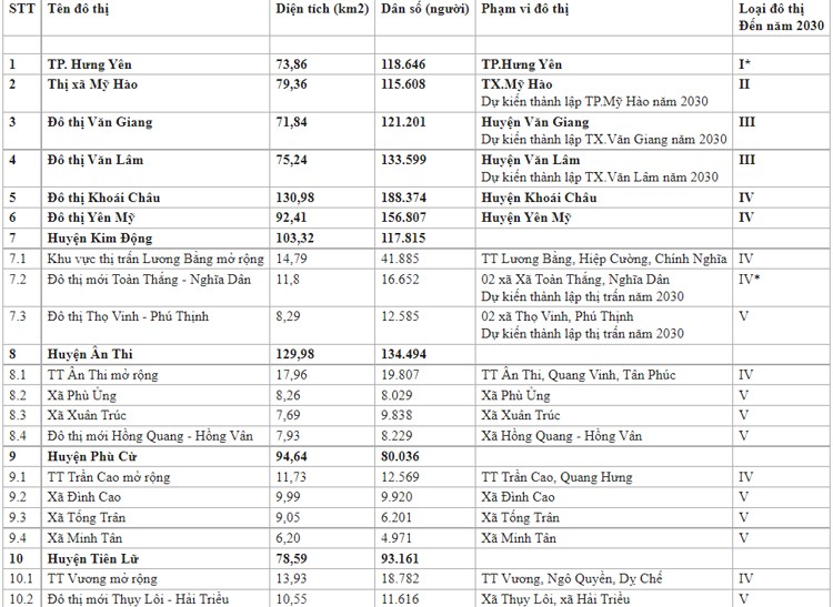 7 đô thị loại IV: đô thị Khoái Châu; đô thị Yên Mỹ; khu vực thị trấn Lương Bằng mở rộng (thị trấn Lương Bằng, Hiệp Cường, Chính Nghĩa); khu vực thị trấn Ân Thi mở rộng (thị trấn Ân Thi, Quang Vinh, Tân Phúc); khu vực thị trấn Trần Cao mở rộng (thị trấn Trần Cao, Quang Hưng); khu vực thị trấn Vương mở rộng (thị trấn Vương, Ngô Quyền, Dỵ Chế); khu vực 2 xã Toàn Thắng, Nghĩa Dân - huyện Kim Động.
