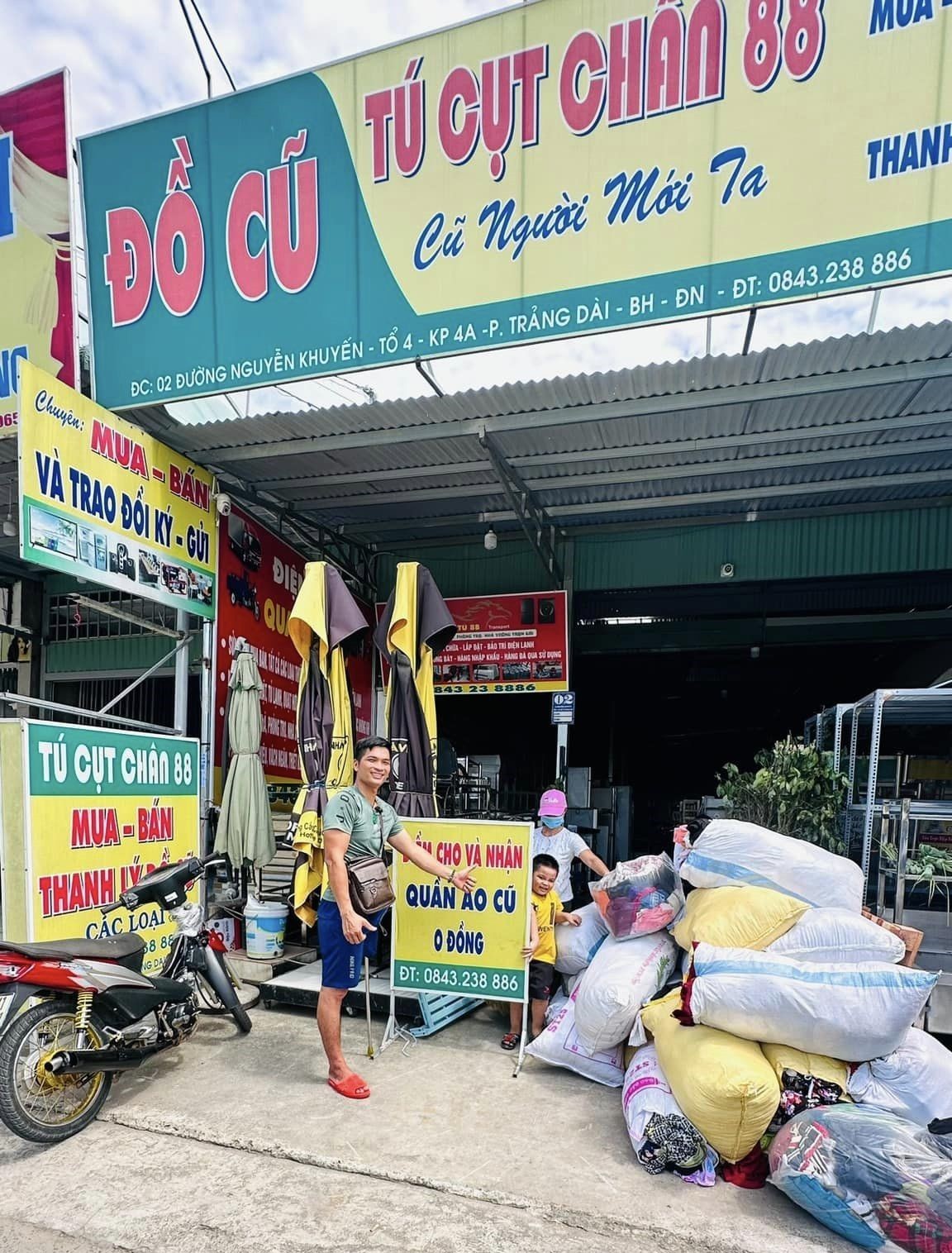 | Chàng trai một chân Từ Quang Tú bên cạnh "khu chợ 0 đồng". Ảnh do nhân vật cung cấp. |