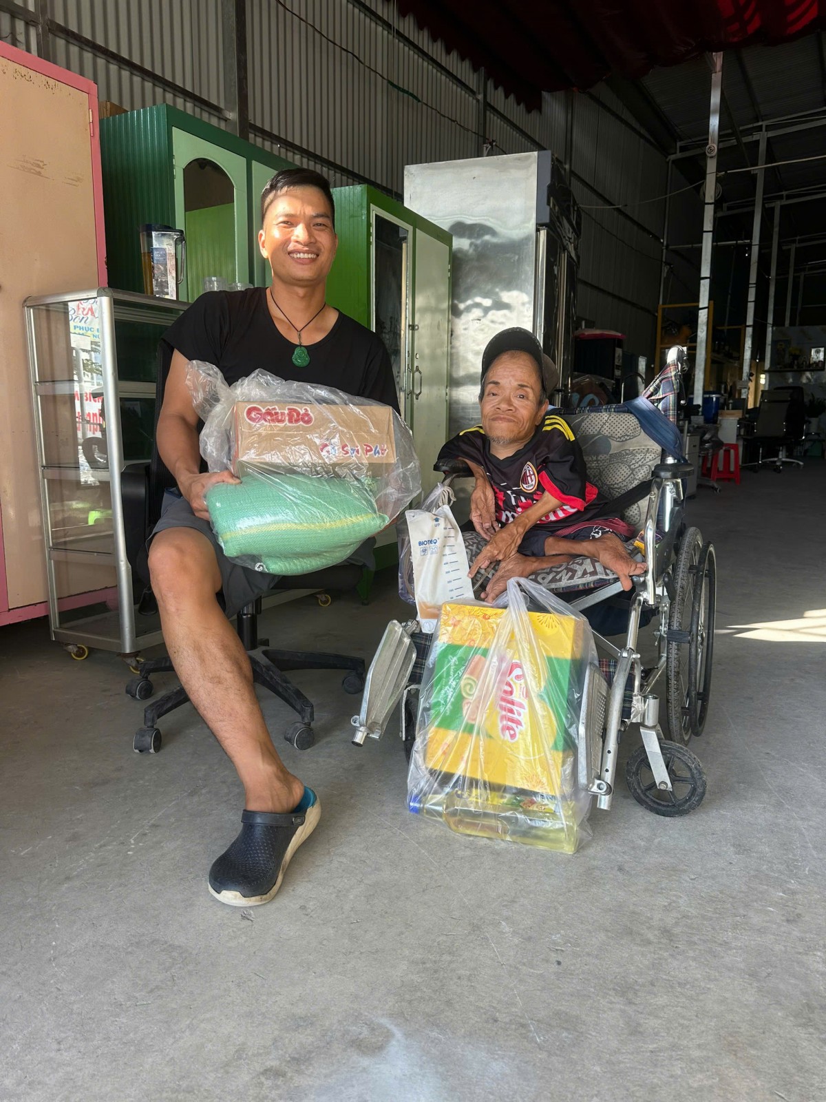 | Anh Tú trao tặng mỳ, gạo, bánh kẹo và xe lăn cho chú Quyết, một người lao động khuyết tật tại Bình Dương. Ảnh do nhân vật cung cấp. |