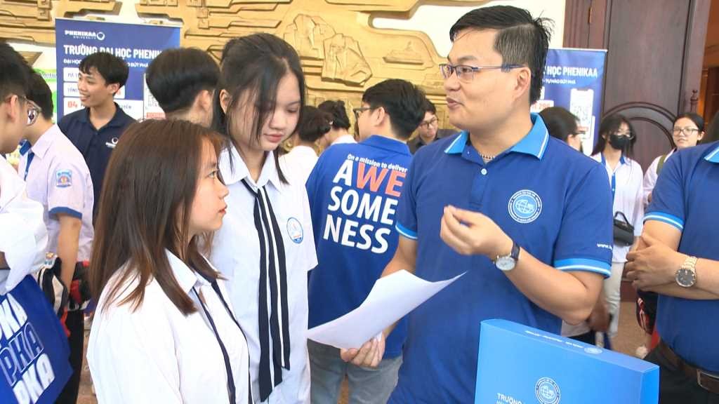 Đại diện các trường đại học, cao đẳng tại Quảng Ninh tư vấn cho học sinh tại chương trình "Tư vấn mùa thi, định hướng nghề nghiệp năm 2024". Ảnh: Thu Phương. |