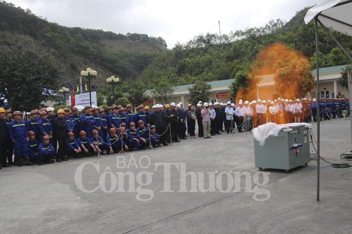 Các đại biểu, khách mời cùng hơn 500 công nhân Công ty Than Hòn Gai xem trình diễn mô phỏng cháy nổ khí metan