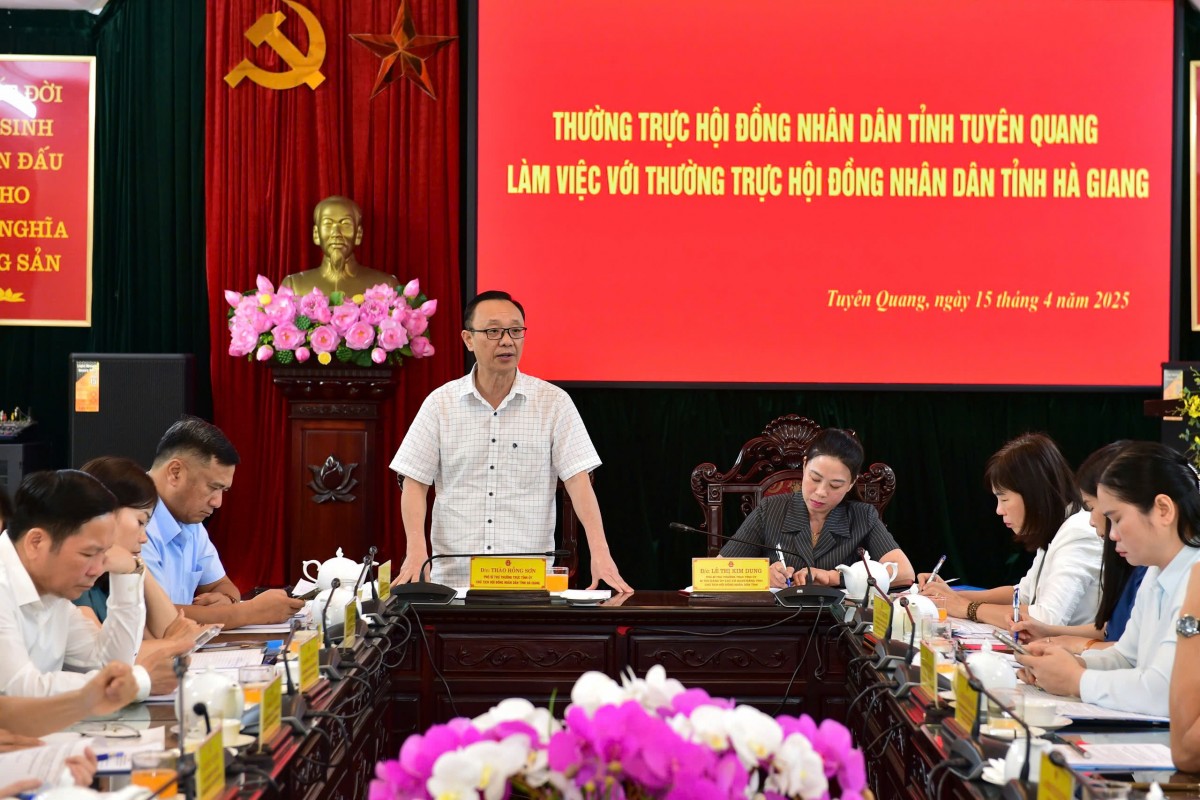Thực hiện Quyết định số 01-QĐ/TU ngày 14/4/2025 của Tỉnh uỷ Tuyên Quang và Hà Giang về thành lập Ban Chỉ đạo hợp nhất đơn vị hành chính tỉnh Tuyên Quang và tỉnh Hà Giang, chiều 15/4, Thường trực HĐND tỉnh đã có buổi làm việc với Thường trực HĐND tỉnh Hà Giang nhằm trao đổi, thảo luận về việc xây dựng phương án hợp nhất HĐND cấp tỉnh theo chủ trương sắp xếp đơn vị hành chính cấp tỉnh.