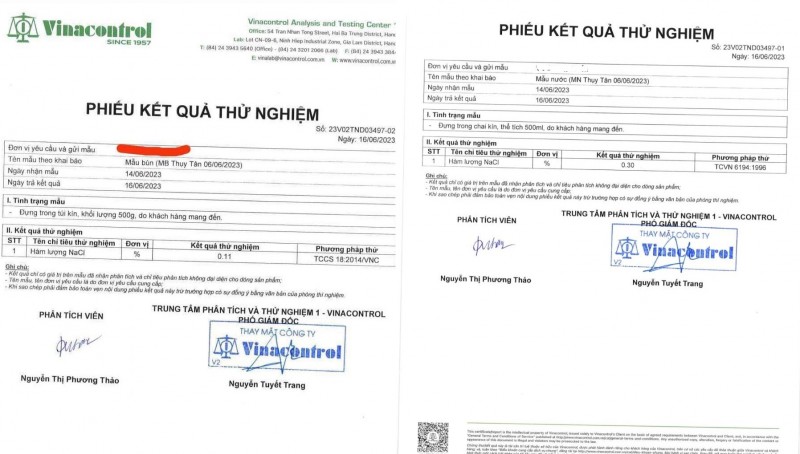 Đáng chú ý, người dân tại 5 thôn đã tự đi lấy mẫu nước, đất và đem đi xét nghiệm. Thông tin tới Báo Công Thương người dân cho biết: Ngày 16/6/2023, Trung tâm Phân tích và Thử nghiệm 1 – VINACONTROL đã có phiếu kết quả thử nghiệm về mẫu nước và mẫu đất (lấy ngày 06/06/2023) do khách hàng mang đến. Ngày 16/6/2023 (ngày nhận mẫu 14/6) Trung tâm Phân tích và Thử nghiệm 1 đã trả kết quả phân tích của mẫu nước cho thấy, hàm lượng NaCl (là muối chủ yếu tạo ra độ mặn trong các đại dương) có trong nước là 0,30% (tương đương 3 phần nghìn). Đồng thời, hàm lượng NaCl có trong mẫu bùn (đựng trong túi kín, khối lượng 500g) là 0,11% (tương đương 1,1 phần nghìn).