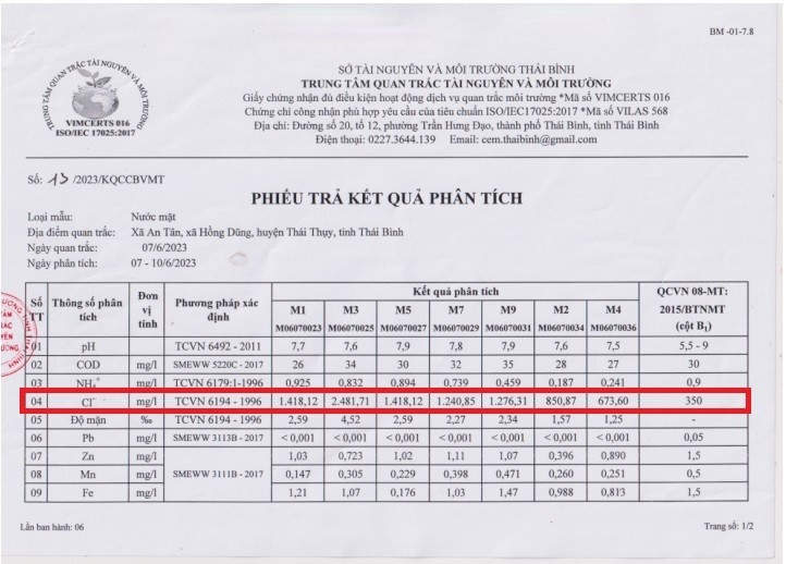 Báo cáo của Sở Nông nghiệp và Phát triển nông thôn Thái Bình gửi UBND tỉnh Thái Bình và Báo Công Thương là vậy. Song, ngày 7/6/2023, Sở Tài nguyên và Môi trường tỉnh Thái Bình tổ chức lấy mẫu nước và đất để phân tích các chỉ số. Cụ thể, Trung tâm Quan trắc tài nguyên và Môi trường (Sở Tài nguyên và Môi trường tỉnh Thái Bình) đã xuống thực địa, lấy 7 mẫu nước mặt (5 mẫu tại xã An Tân và 2 mẫu ở xã Hồng Dũng) để phân tích. Kết quả cho thấy, trong các thông số phân tích nổi lên chỉ số Clo có mức cao đột biến. Cụ thể, mẫu nước mặt lấy tại sông Chung Thủy Nông, thôn Tân Dũng, xã An Tân, có kết quả phân tích cao nhất là hơn 2.481mg/l.