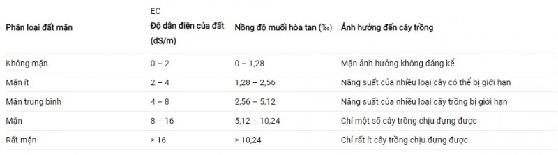 bảng “Các loại đất mặn (phân theo nồng độ) và ảnh hưởng đối với cây trồng” được xác định bởi Đại học Utah State University