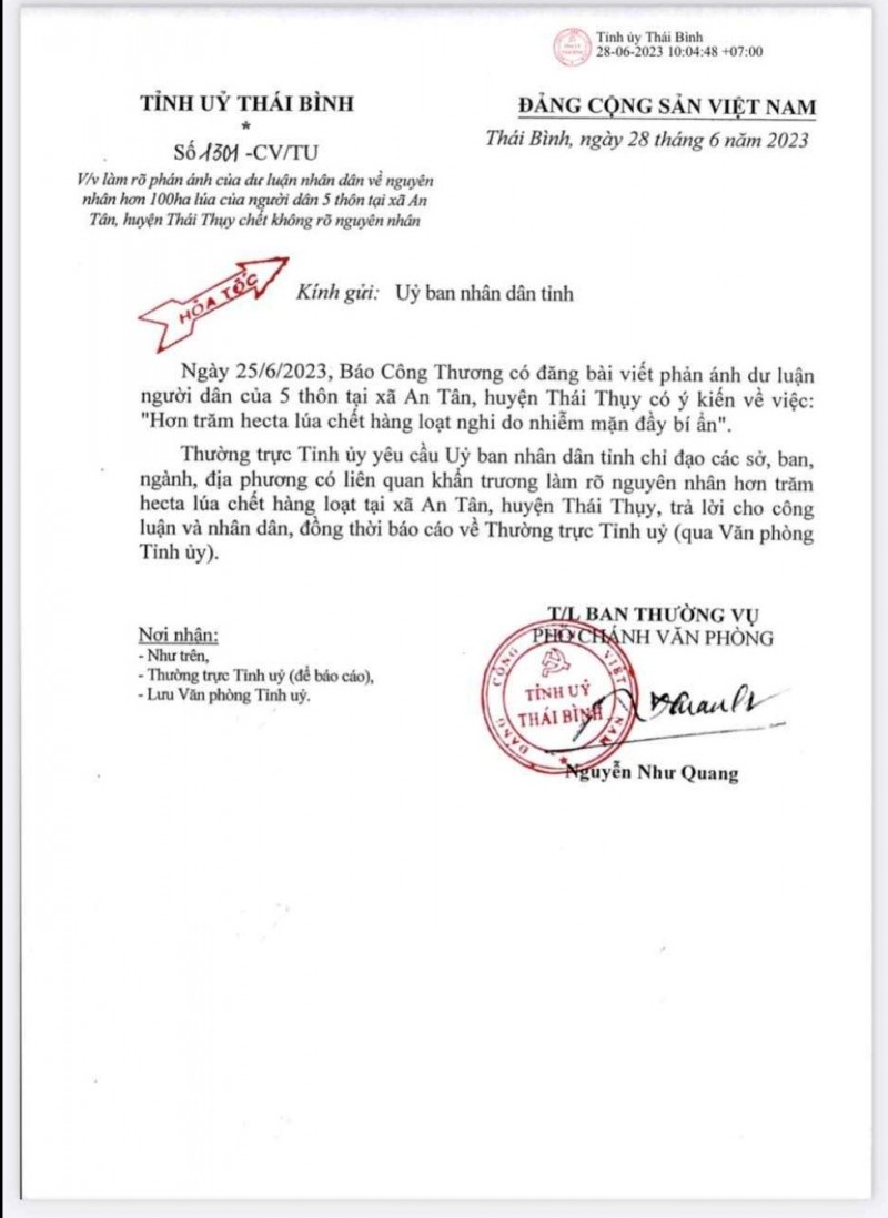 Ngay sau khi nhận được phản ánh của Báo Công Thương, ngày 28/6, Tỉnh ủy Thái Bình đã có Công văn hỏa tốc số 1301/CV-TU gửi UBND tỉnh Thái Bình về việc làm rõ phản ánh của dư luận người dân của 5 thôn tại xã An Tân, huyện Thái Thụy chết không rõ nguyên nhân. Theo đó, Tỉnh ủy Thái Bình cho biết: Báo Công Thương có đăng tải bài viết phản ánh dư luận nhân dân 5 thôn xã An Tân có ý kiến về việc: Hơn trăm hecta lúa chết hàng loạt nghi do nhiễm mặn đầy bí ẩn”.