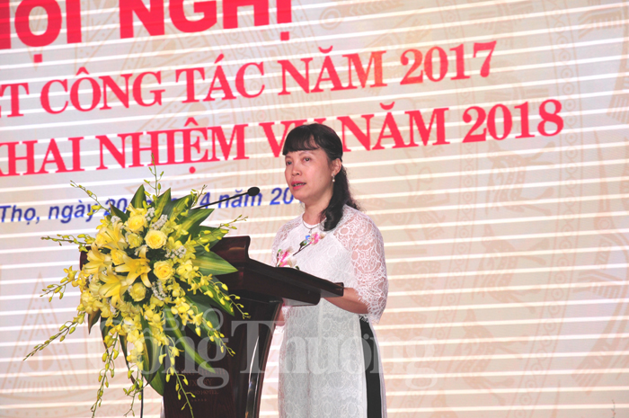 | Phó Bí thư Đảng bộ Tổng công ty Trần Thị Hoàng Mai đọc báo cáo tổng kết |