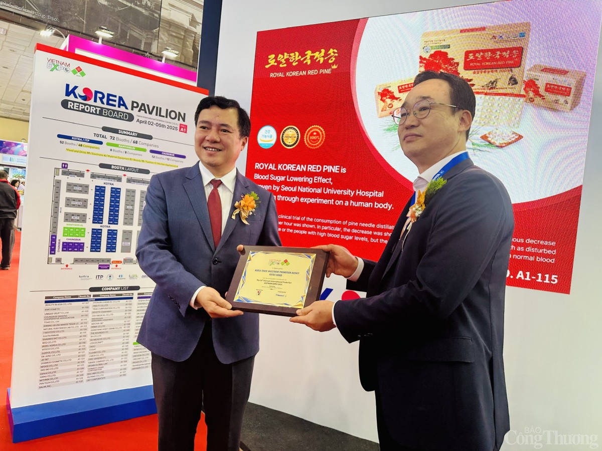 Thứ trưởng Bộ Công Thương Nguyễn Sinh Nhật Tân (bên trái) trao Giấy chứng nhận tham gia hội chợ cho đại diện một gian hàng Hàn Quốc. |
