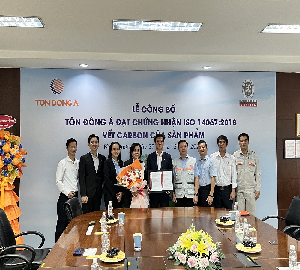 Đại diện Bureau Veritas Việt Nam, Bà Nguyễn Thái Thảo Vy - Giám đốc chứng nhận đánh giá cao những nỗ lực không ngừng của Tôn Đông Á trong việc vận hành, duy trì và cải tiến quy trình nhằm giảm thiểu lượng phát thải carbon, phát triển các sản phẩm thân thiện với môi trường phù hợp với xu hướng kinh tế tuần hoàn. Bureau Veritas tin tưởng rằng việc áp dụng tiêu chuẩn ISO 14067:2018 sẽ giúp Tôn Đông Á gia tăng lợi thế cạnh tranh, đáp ứng các yêu cầu khắt khe từ thị trường quốc tế, đồng thời củng cố vững chắc vị thế của Công ty là một trong những doanh nghiệp thép mạ hàng đầu tại Việt Nam.