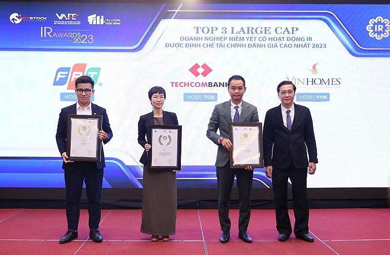 Top 3 Large Cap có hoạt động IR được Định chế tài chính đánh giá cao nhất 2023 là: Công ty Cổ phần Vinhomes (HOSE: VHM); Công ty Cổ phần FPT(HOSE: FPT) và Ngân hàng TMCP Kỹ Thương Việt Nam (HOSE: TCB).