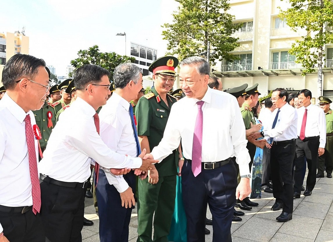 Tổng Bí thư, Chủ tịch nước Tô Lâm; Bí thư Thành ủy TP. Hồ Chí Minh Nguyễn Văn Nên; Thượng tướng Lương Tam Quang, Bộ trưởng Bộ Công an; Lãnh đạo Văn phòng Trung ương Đảng, Bộ Công an; Ban Thường vụ Thành ủy TP. Hồ Chí Minh... dự lễ.