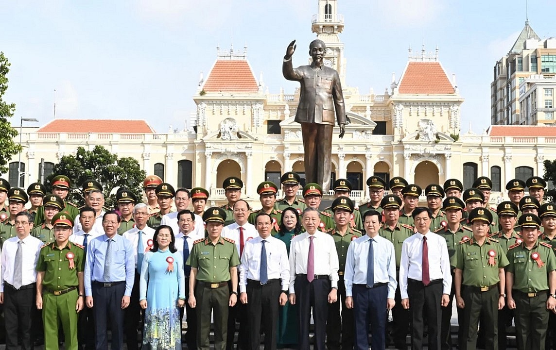 Sáng 17/8, tại công viên Tượng đài Bác Hồ (quận 1, TP. Hồ Chí Minh), đoàn đại biểu Đảng ủy Công an Trung ương, Bộ Công an và đoàn đại biểu Thành ủy - HĐND - UBND - Ủy ban Mặt trận Tổ quốc Việt Nam TP. Hồ Chí Minh tổ chức Lễ dâng hoa, báo công Chủ tịch Hồ Chí Minh nhân kỷ niệm 79 năm Ngày Cách mạng Tháng Tám (19/8/1945 – 19/8/2024) và kỷ niệm 55 năm thực hiện Di chúc của Chủ tịch Hồ Chí Minh (1969-2024).