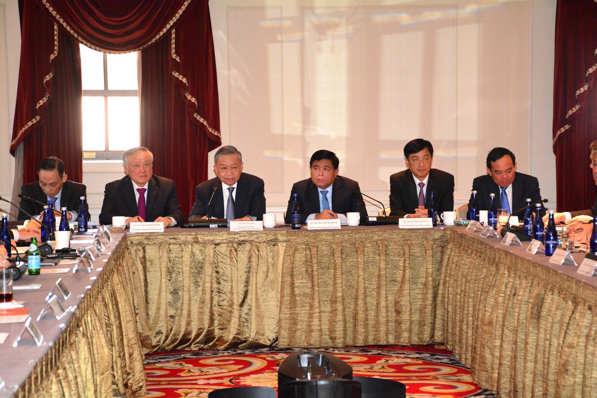 | Bộ trưởng Bộ Công Thương Nguyễn Hồng Diên (thứ hai từ trái sang) cùng các đại biểu cấp cao của Việt Nam tham dự toạ đàm. Ảnh: Phạm Kiên |
