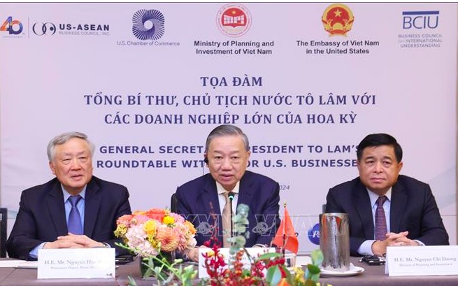 Theo đặc phái viên TTXVN, nhân dịp tham dự các hoạt động của Tuần lễ cấp cao Đại hội đồng Liên hợp quốc khoá 79 và làm việc tại Hoa Kỳ, chiều 23/9 tại New York, Tổng Bí thư, Chủ tịch nước Tô Lâm đã dự buổi toạ đàm doanh nghiệp do Hội đồng Doanh nghiệp Hoa Hoa Kỳ - ASEAN (USABC), Phòng Thương mại Hoa Kỳ (USCC) và Hội đồng doanh nghiệp vì sự hiểu biết chung (BCIU) phối hợp với Bộ Kế hoạch và Đầu tư và Đại sứ quán Việt Nam tại Hoa Kỳ tổ chức.