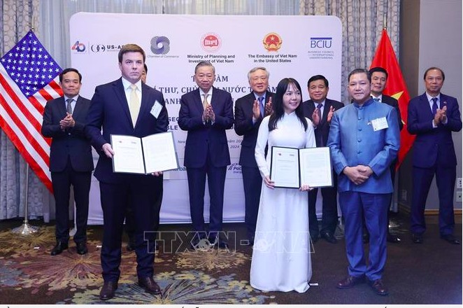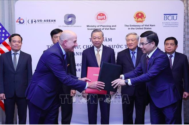 Nhân dịp này, Tổng Bí thư, Chủ tịch nước đã chứng kiến lễ trao các văn kiện được ký kết giữa các doanh nghiệp Việt Nam và Hoa Kỳ bao gồm: Thỏa thuận hợp tác về chuyển đổi năng lượng và nghiên cứu chuyển giao công nghệ trong lĩnh vực năng lượng giữa Tập đoàn Dầu khí Quốc gia Việt Nam (PVN) và Công ty Kellogg Brown & Root; Biên bản ghi nhớ về nghiên cứu, cung cấp giải pháp phần mềm trong ngành điện và dầu khí giữa PVN và Tập đoàn GE; Thỏa thuận hợp tác trong lĩnh vực khí hoá lỏng (LNG) giữa Công ty cổ phần Kỹ thuật Dịch vụ Dầu khí Việt Nam (PTSC) và Công ty Excelerate Energy; Biên bản ghi nhớ trong lĩnh vực Al, bán dẫn và xây dựng trung tâm dữ liệu tại Việt Nam giữa tập đoàn Sovico và tập đoàn SuperMicro; Thỏa thuận hợp tác trong lĩnh vực hàng không giữa Vietjet Air và Công ty Honeywell; Thỏa thuận hợp tác trong lĩnh vực sản xuất khí tự nhiên giữa Wealth Power Group Vietnam và đại diện Công ty Eternal Natural Resources.