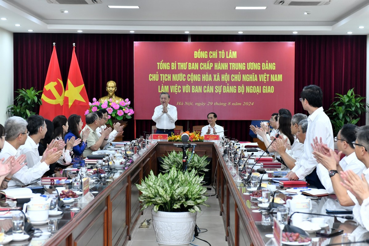 Tại buổi làm việc, Tổng Bí thư, Chủ tịch nước Tô Lâm biểu dương những kết quả khá toàn diện của toàn ngành Ngoại giao đạt được từ đầu nhiệm kỳ Đại hội XIII của Đảng đến nay. Nhấn mạnh với thế và lực sau 40 năm đổi mới đất nước, Tổng Bí thư, Chủ tịch nước Tô Lâm đề nghị, toàn ngành Ngoại giao chủ động kịp thời phát hiện cơ hội, thách thức, tăng cường đóng góp tích cực của Ngoại giao trong việc thực hiện thắng lợi các mục tiêu chiến lược 100 năm dưới sự lãnh đạo của Đảng, 100 năm thành lập nước Việt Nam Dân chủ Cộng hoà, nay là nước Cộng hoà Xã hội chủ nghĩa Việt Nam; tiếp tục nâng tầm mở rộng đóng góp của Việt Nam cho sự nghiệp cách mạng thế giới, cho hoà bình hợp tác phát triển và tiến bộ của nhân loại.