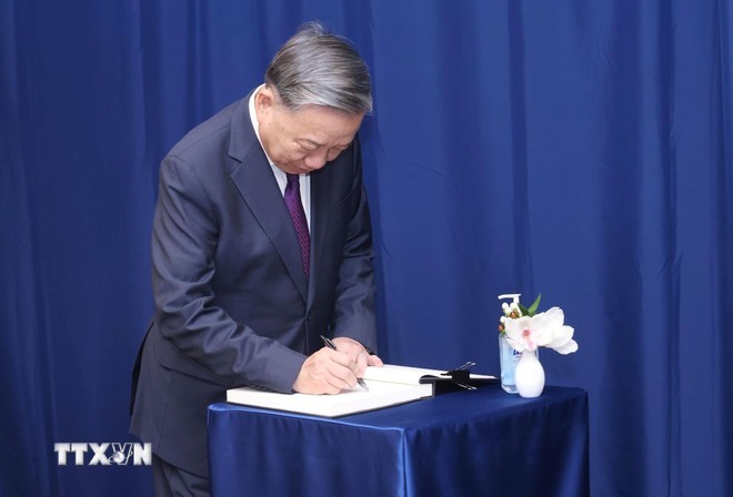 Tổng Bí thư, Chủ tịch nước Tô Lâm ghi lưu bút. (Ảnh: Lâm Khánh/TTXVN) |