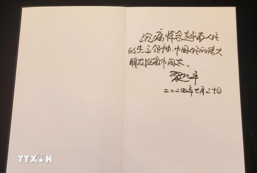 | Tổng Bí thư, Chủ tịch Trung Quốc Tập Cận Bình ghi dòng chữ trong Sổ tang: "Vô cùng thương tiếc đồng chí Nguyễn Phú Trọng, lãnh tụ kiệt xuất của nhân dân Việt Nam, người bạn vĩ đại của nhân dân Trung Quốc". Ảnh: Thành Dương/PV TTXVN tại Trung Quốc |