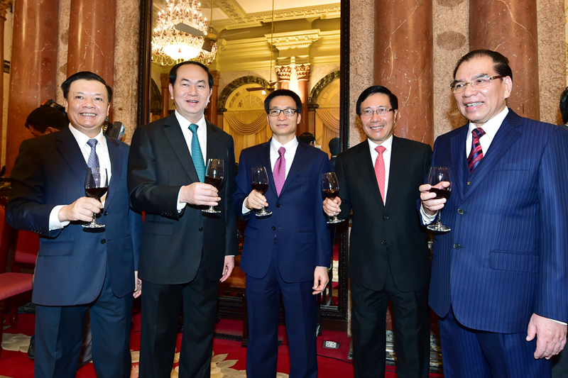 | Các đồng chí lãnh đạo nâng ly chúc mừng năm mới. Ảnh: VGP/Nhật Bắc |