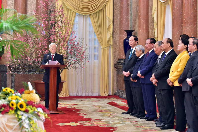 Tổng Bí thư Nguyễn Phú Trọng nhấn mạnh, đất nước ta vừa đi qua năm Bính Thân 2016 - năm đầu thực hiện Nghị quyết Đại hội lần thứ XII của Đảng với rất nhiều các sự kiện sôi động và phong phú. Nổi bật là đã tổ chức thành công Đại hội Đại biểu toàn quốc lần thứ XII của Đảng và cuộc bầu cử đại biểu Quốc hội khóa XIV, đại biểu Hội đồng nhân dân các cấp nhiệm kỳ 2016-2021. Đã nhanh chóng kiện toàn tổ chức, nhân sự bộ máy nhà nước, giữ vững ổn định chính trị và khẩn trương triển khai thực hiện các mục tiêu, nhiệm vụ đã đề ra.